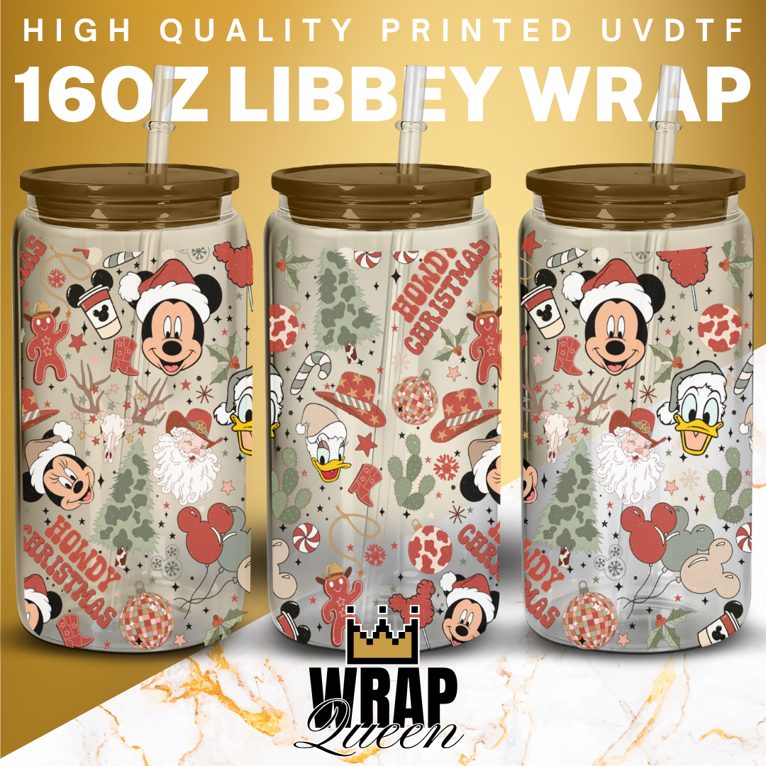 Mouse and Friends HOWDY Christmas UV DTF 16oz Glass Cup Wrap